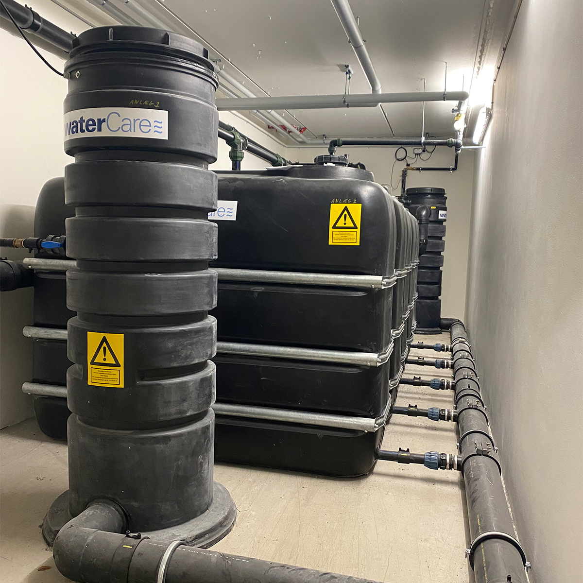 Anlæggene dimensioneres ud fra tagareal, ønsket lagringsvolumen og forbrugsmønster. Til private hjem bruges typisk tanke på 1,2–10 m³, mens boligforeninger og erhvervsbyggerier ofte kræver større anlæg, som nedgraves, så de er skjulte og let tilgængelige via dæksler. Indendørs tanke til placering i kælderen kan kobles sammen for at skabe større kapacitet og nemmere installation. Uanset størrelse hjælper vi med at sikre, at anlægget er korrekt dimensioneret i forhold til nedbør, forbrug og genanvendelsesmål og at anlægget passer til dit behov.