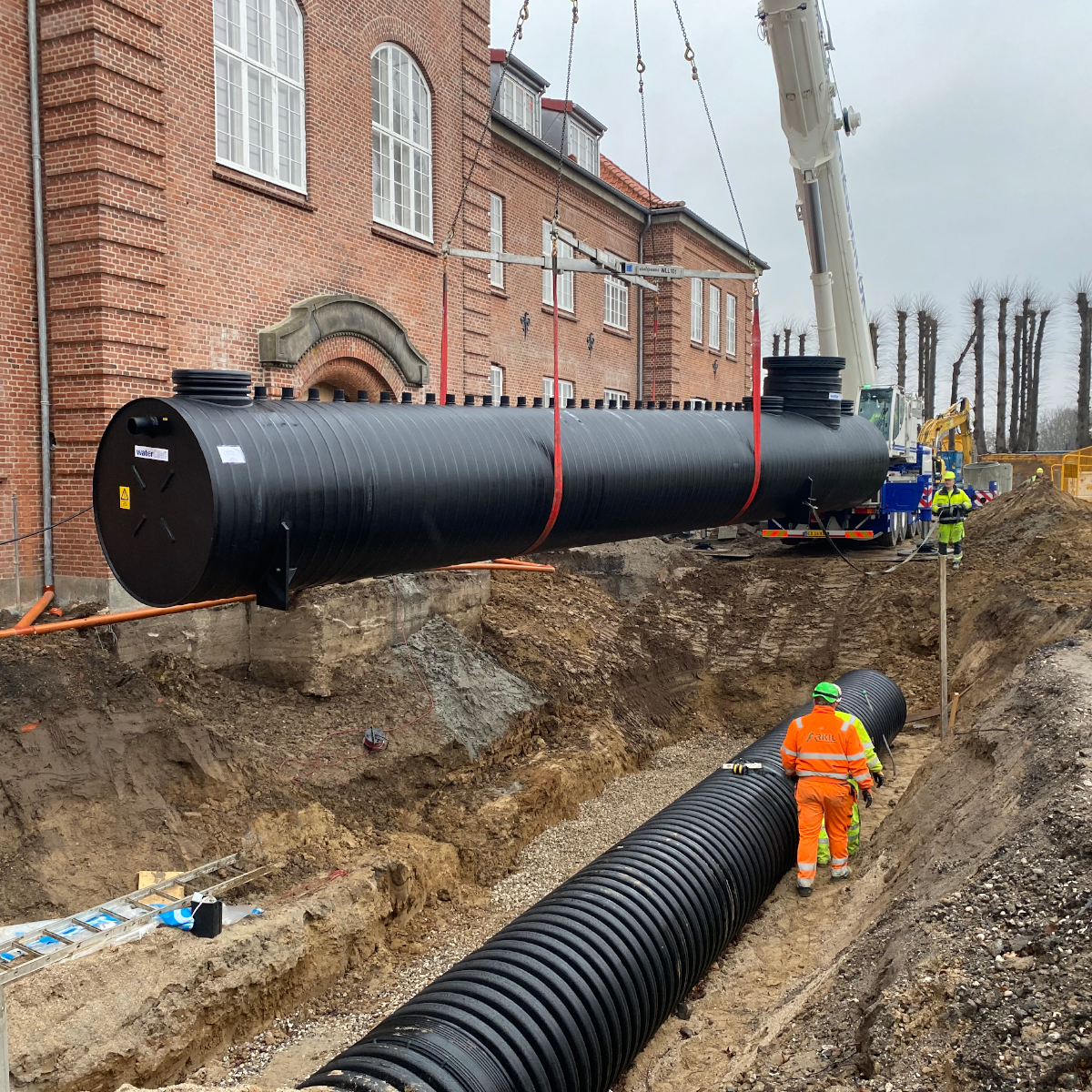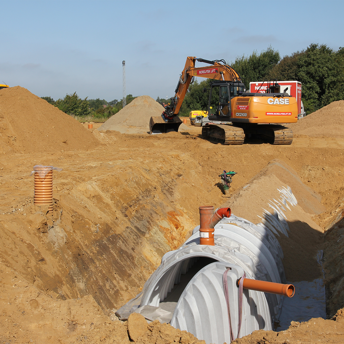 nedsivningen foregår i modulopbyggede faskiner, til større installationer i boligområder og erhvervsbyggerier, hvor der kan være behov for flere hundrede meter faskinetunneler eller en løsning i rør. Vores systemer er modulopbyggede og kan installeres både i dybden og bredden afhængigt af pladsforhold. Alle løsninger tilpasses kravene til lokal afledning af regnvand (LAR) og kan kombineres med forbehandlingsmoduler som sandfang eller olieudskillere efter behov. Vi tilpasser anlæggene så de passer lige til jeres behov.