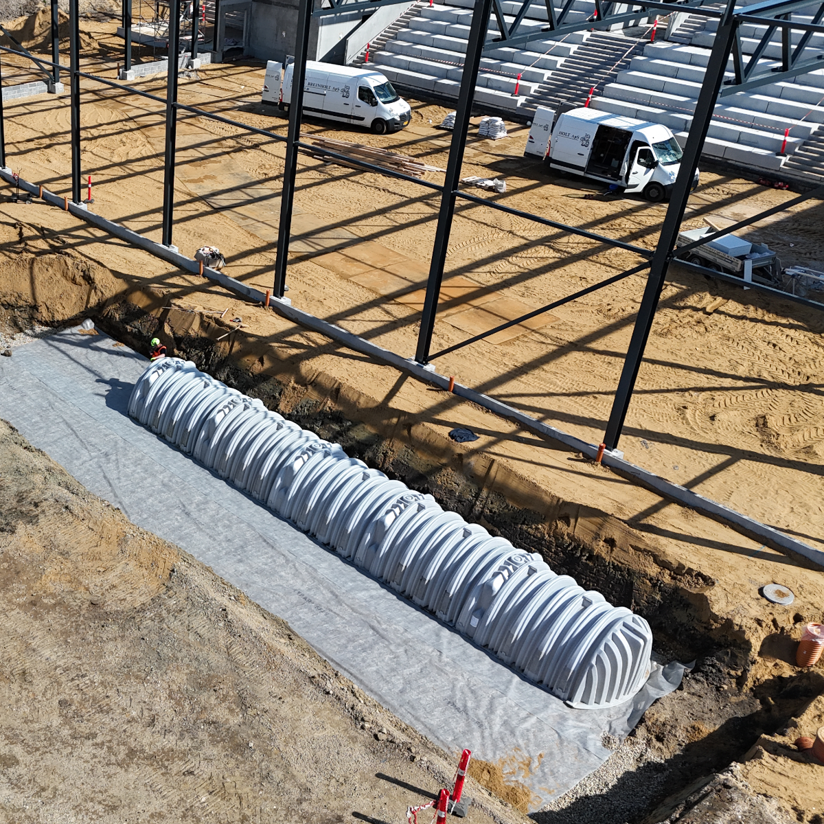 WaterCare Faskinetunneler til nedsivning er et fleksibelt modulsystem med høj kapacitet, der nemt kan tilpasses de tilgængelige arealer. Deres styrke til at modstå tung trafik gør det muligt at placere dem under en parkeringsplads, hvilket sikrer optimal udnyttelse af grunden.
