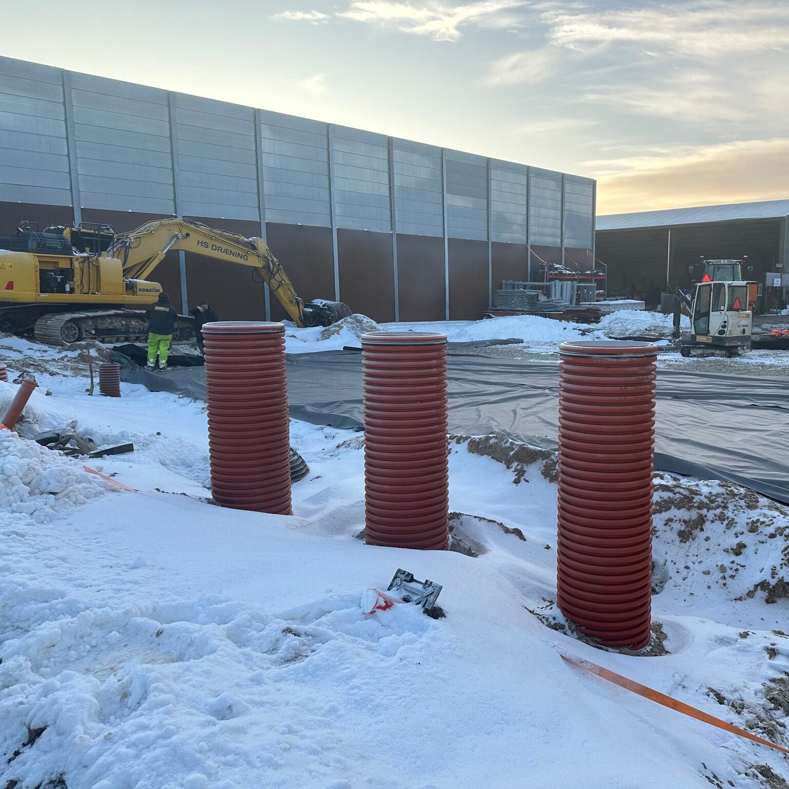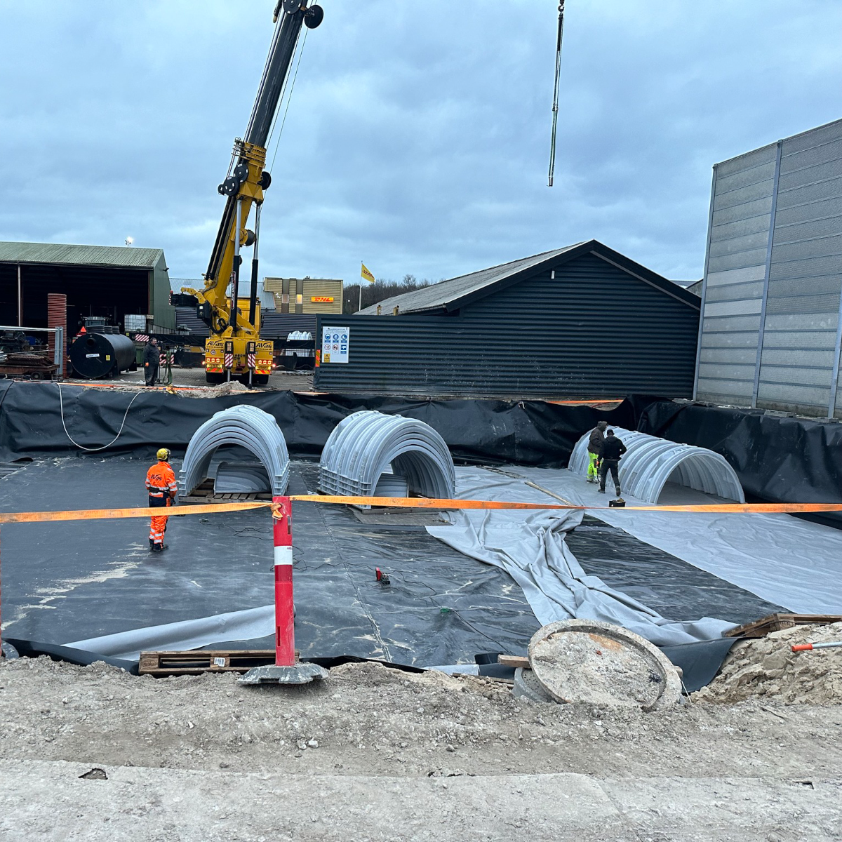 HS Dræn Hjallerup stod for installationen, som forløb let og gnidningsfrit. Først blev der lagt en membran ud i udgravningen, der sikrer en tæt bund. Faskinetunnelerne blev herefter placeret i udgravningen med maskine, hvor modulerne samles hurtigt ved overlap af ribberne og selvskærende skruer ved hvert overlap.
