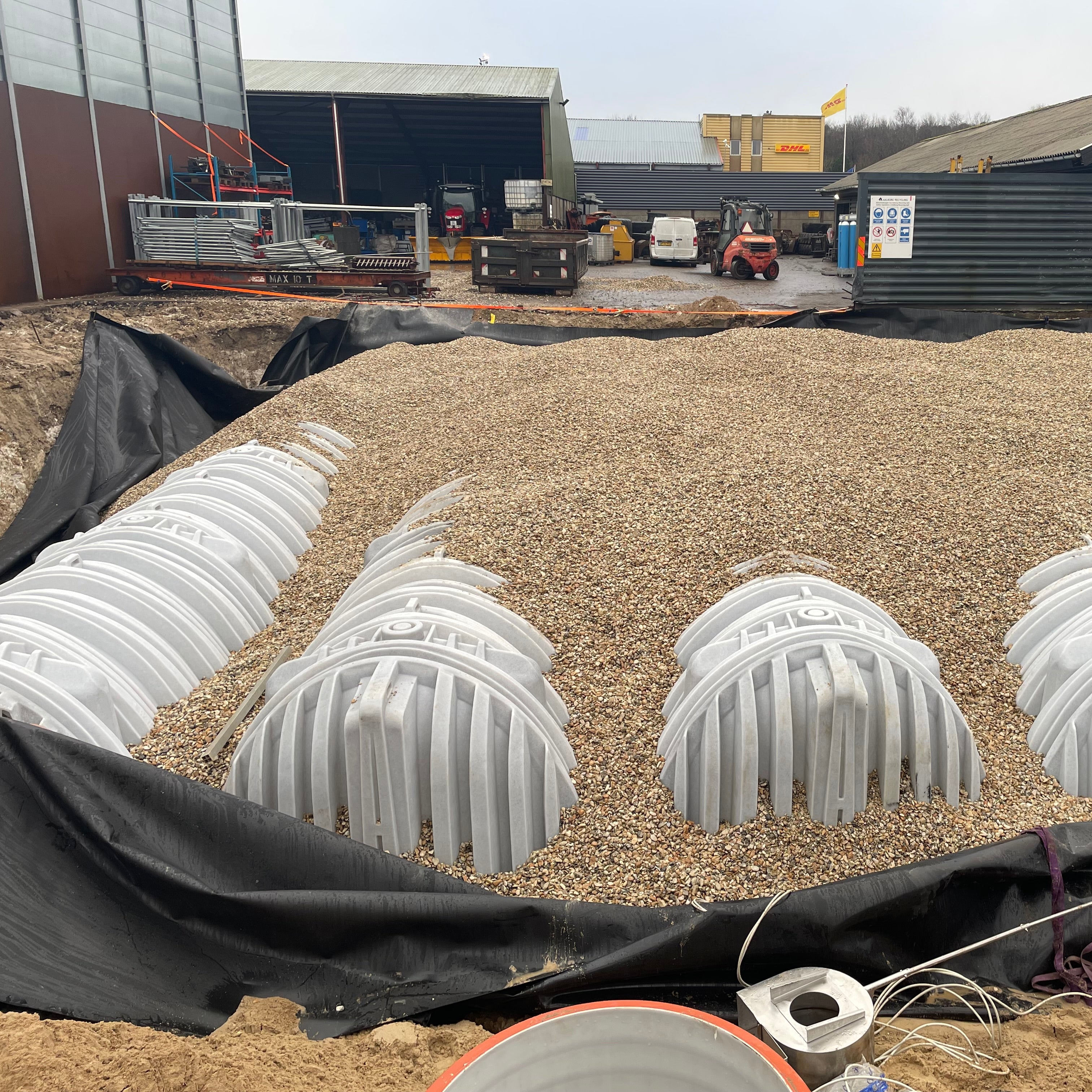 Klimaforandringer skaber i dag ekstreme vejrforhold med hyppigere og mere intense skybrud, hvilket udfordrer mange lokale kloaksystemer. Aalborg Recycling, beliggende på Mineralvej 27 i Aalborg Øst, oplevede denne problematik ved kraftige regnskyl. Derfor kunne den offentlige kloak ikke følge med, hvilket truede med oversvømmelser og forurening, da regn- og overfladevand fra virksomheden indeholdt olie fra jern- og metalskrot.Kunden valgte derfor en LAR-løsning (Lokal Afledning af Regnvand) fra WaterCare, bestående af en 315 m³ Faskinetunnel moduleret op i 8 rækker for at tilpasse sig udgravningen under et nyt parkeringsareal, hvor der dagligt kører lastbiler med tung trafiklast. Hertil en olieudskiller, hvis formål er at rense olieholdigt regn- og overfladevand fra grunden, inden det udledes til det offentlige kloaksystem.